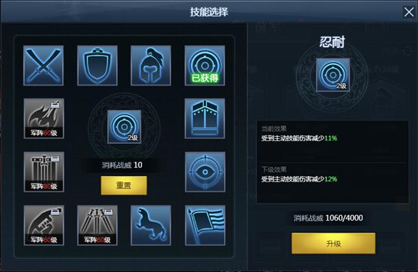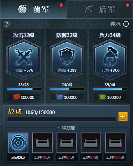 前后军都将拥有各自的军阵,可以通过攻击、防御、兵力战旗进行提升,可以提升兵种对应的属性,当达到一定等级后,可以开启军阵技能,军阵技能可以大大提升兵种战斗力,可以通过消耗战威来获得和升级,而且大家可以更具自己的战术去选择有自己特色的军阵技能,使战斗存在更多变数。