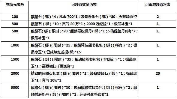 一、花点小钱玩一玩,充值好礼送不停! 【活动时间】6月11日 【活动范围】 未在开服活动中的区服 【活动内容】活动期间,玩家累计充值达到一定的数额即可领取对应好礼 【活动奖励】 ...