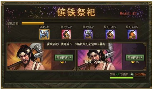 【兵器升级大福利】镔铁祭祀,暴击连送! 活动范围:6月6日(含)之前所有已开在线服 活动时间:6月13日0点至6月14日24点活动内容:活动期间,达到以下镔铁祭祀要求,即可获赠额外镔铁奖励,并领取相应的暴击Buff!1 ...