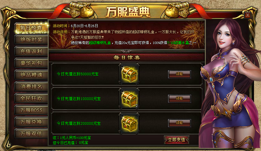 本帖最后由 夏日大猫熊 于 2014-6-20 09:57 编辑 活动一、每日惊喜活动时间6月20号0:00-6月26号23:59活动介绍作为一个里程碑式的纪念,万载难遇的万服盛典当然带来了物超所值的道具——超级精钢礼盒,一种完全碾 ...
