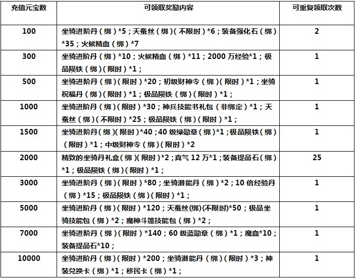一、花点小钱玩一玩,充值好礼送不停! 【活动时间】6月23日 【活动范围】未在开服活动中的区服 【活动内容】活动期间,玩家累计充值达到一定的数额即可领取对应好礼 【活动奖励】 注:以上兑换所得的材料均为绑定 ...