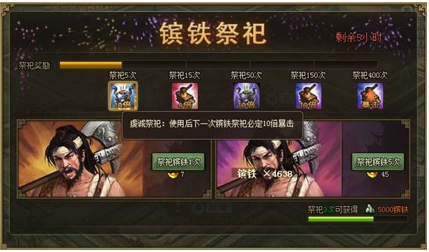 【兵器升级大福利】镔铁祭祀,暴击连送! 活动范围:6月18日(含)之前所有已开在线服 活动时间:6月25日0点至6月26日24点活动内容:活动期间,达到以下镔铁祭祀要求,即可获赠额外镔铁奖励,并领取相应的暴击Buff! ...
