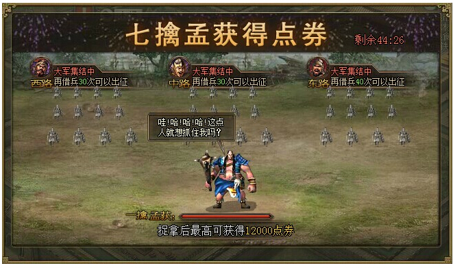 【新版神秘活动】三路大军征南蛮 七擒孟获得点券! 活动范围:6月21日(含)之前已开所有服活动时间:6月28日0点至6月29日24点参与条件:已开启世界地图活动玩法:活动期间,通过任意战斗中的“借兵”(除单人剧本 ...