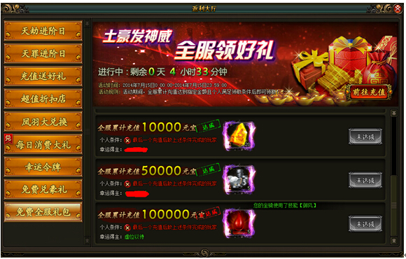 土豪发神威,全服领好礼(具体奖励内容已游戏中为准)土豪发神威,全服领好礼活动创世来袭,凡全服累计充值达到一定数额,玩家个人满足一定的条件即可领取各种超值大礼【活动时间】8月2日-8月5日【活动范围】未在开 ...