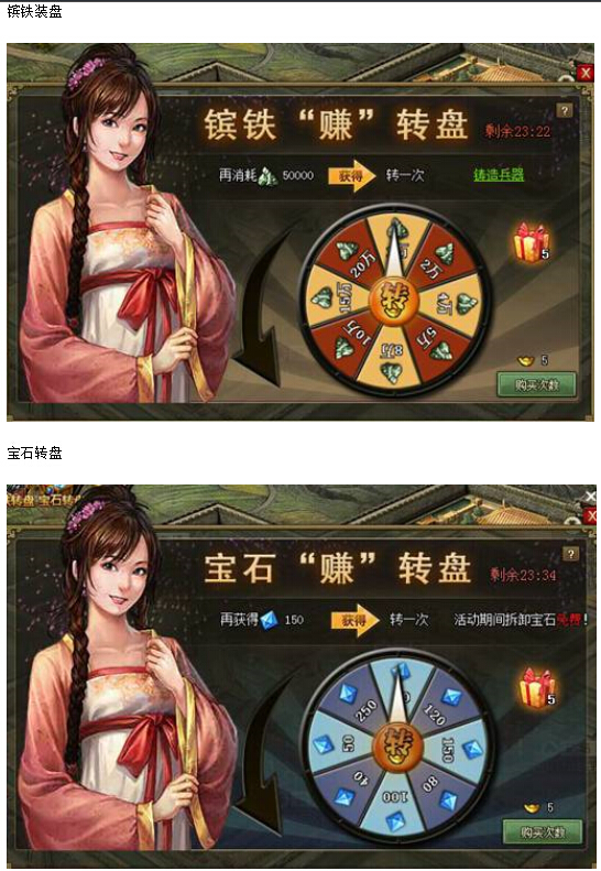 周末大转盘 镔铁、宝石,想要哪个“赚”哪个! 活动范围:8月23日(含)之前已开所有服 活动时间:8月30日0点至8月31日24点 活动内容:活动期间,分别存在“镔铁”和“宝石”两个转盘,按照自己的需要,可随心所欲的 ...
