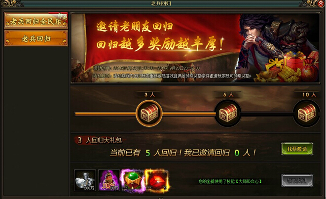 【风云无双】老兵回归活动重拾昔日峥嵘,找回那份感动!老兵回归活动,让你找回昔日战友,共闯风云天下! 老兵回归条件:活动开启前连续超过7天未登录且大于等于60级的玩家在活动期间登录则视为老兵回归 一、老兵回 ...