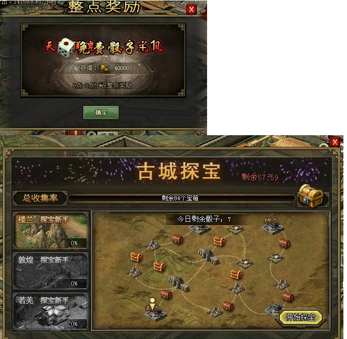 【秘境寻宝】勇闯三大古城,探寻好礼秘宝! 楼兰、敦煌、若羌,三大古城闪耀亮相!每座古城,蕴含着大量经验、粮食等多种财富,更有马踏飞燕、角形玉杯两大新宝物等你探宝巧夺得!来吧! ...