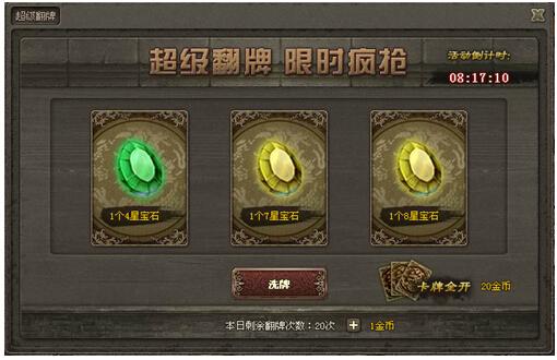超级翻牌 限时疯抢 【活动时间】:10月10日0:00——10月11日0:00【活动内容】:1. 活动期间,130级以上玩家都可参与超级翻牌活动。2. 界面中会出现各种等级的宝石,点击洗牌三张牌翻到背面互相切换位置后,可免费选 ...