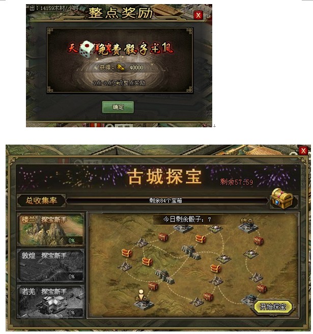活动一、 【秘境寻宝】勇闯三大古城,探寻好礼秘宝! 楼兰、敦煌、若羌,三大古城闪耀亮相!每座古城,蕴含着大量经验、粮食等多种财富,更有马踏飞燕、角形玉杯两大新宝物等你探宝巧 ...