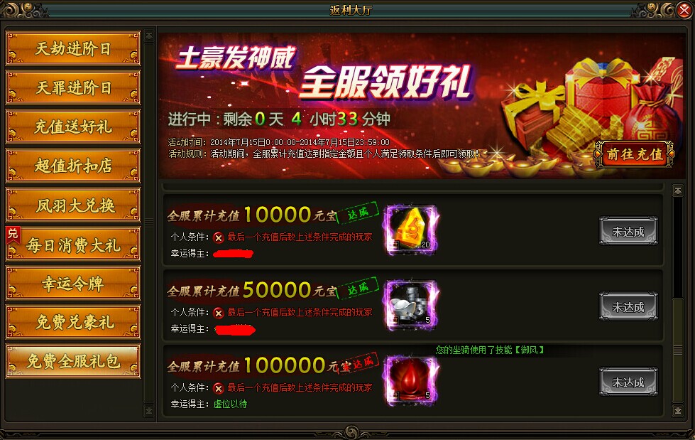 本帖最后由 鹿玲飘飘 于 2014-11-22 17:33 编辑 土豪发神威,全服领好礼活动创世来袭,凡全服累计充值达到一定数额,玩家个人满足一定的条件即可领取各种超值大礼 【活动时间】11月22日-11月24日【活动范围】未在 ...