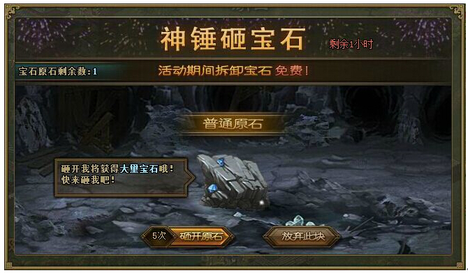 神锤砸宝石,免费摘宝石! 活动范围:12月8日(含)之前所有已开在线服 参与要求:开启宝石功能 活动时间:12月15日0点至24点 活动内容:活动期间,世界上会出现“宝石原石”事件、玩家可选中免费原石,也可花费金 ...