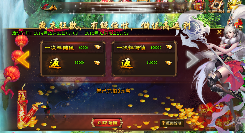 本帖最后由 夏日大猫熊 于 2014-12-29 17:57 编辑 三阳开泰 日新惟良 一、开启岁末返利活动 活动时间:2014年12月30日00:00——2015年1月2日23:59 活动说明: 活动开启后玩家首次单笔充值到达指定元宝可获得相应 ...