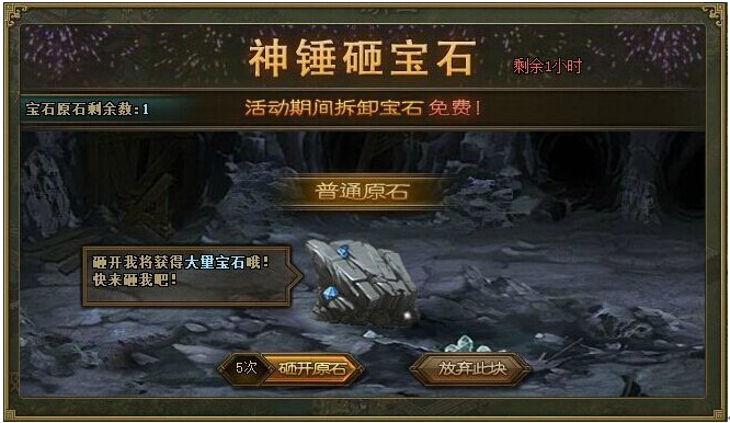 神锤砸宝石,免费摘宝石! 活动范围:1月1日(含)之前所有已开在线服 参与要求:开启宝石功能 活动时间:1月8日0点至24点 活动内容:活动期间,世界上会出现“宝石原石”事件、玩家可选中免费原石,也可花费金币 ...