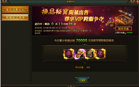 《风云无双》1月14日 争夺极品秘宝(具体奖励内容以游戏中为准)VIP玩家的超级福利,全平台跨服争夺,尊享超级VIP特权,极品秘宝,限时出售,你心动了吗?【活动时间】: 1月14日【活动范围】:除开服活动期间的服外 ...