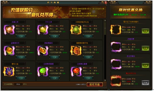 本帖最后由 冥王Fan 于 2015-1-20 23:44 编辑 【风云无双】积分商城(具体奖励内容以游戏中为准)玩家每进行充值10RMB就会获得10积分,积分可在积分商城处兑换道具,更有限时优惠兑换,会上架一些超值的道具供玩 ...