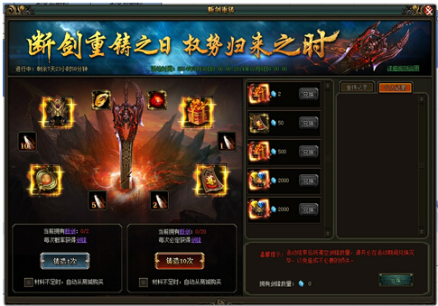 断剑重铸,权势归来(具体奖励内容已游戏中为准)【活动时间】2月3日-2月5日【活动范围】未在开服活动中的区服【活动内容】活动期间,可使用断剑进行铸造,每次铸造消耗两个断剑,。铸造后有机会获得道具奖励或剑锋 ...