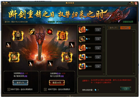断剑重铸,权势归来(具体奖励内容已游戏中为准)【活动时间】3月2日【活动范围】未在开服活动中的区服【活动内容】活动期间,可使用断剑进行铸造,每次铸造消耗两个断剑,。铸造后有机会获得道具奖励或剑锋,累计一 ...