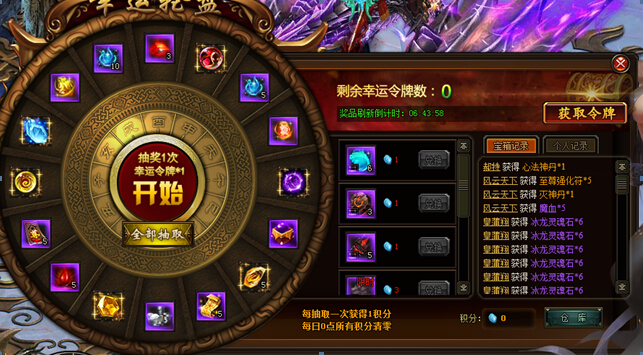 幸运轮盘(具体奖励内容已游戏中为准)【活动时间】3月7日-3月9日【活动范围】未在开服活动中的区服【活动内容】活动期间,凡充值即可领取幸运令牌以及积分,幸运令牌可进行抽奖,积分可用来兑换奖励。【活动一览】 ...