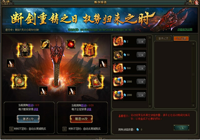 断剑重铸,权势归来(具体奖励内容已游戏中为准)【活动时间】3月7日-3月9日【活动范围】未在开服活动中的区服【活动内容】活动期间,可使用断剑进行铸造,每次铸造消耗两个断剑,。铸造后有机会获得道具奖励或剑锋 ...