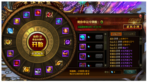 幸运轮盘(具体奖励内容已游戏中为准)【活动时间】3月11日【活动范围】未在开服活动中的区服【活动内容】活动期间,凡充值即可领取幸运令牌以及积分,幸运令牌可进行抽奖,积分可用来兑换奖励。【活动一览】:抽奖 ...