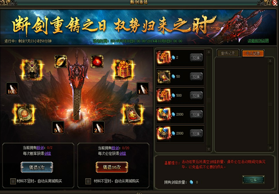 断剑重铸,权势归来(具体奖励内容已游戏中为准)【活动时间】3月13日【活动范围】未在开服活动中的区服【活动内容】活动期间,可使用断剑进行铸造,每次铸造消耗两个断剑,。铸造后有机会获得道具奖励或剑锋,累计 ...