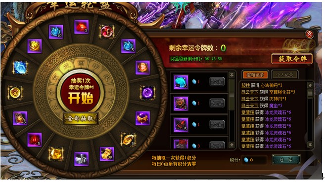 幸运轮盘(具体奖励内容已游戏中为准)【活动时间】3月18日【活动范围】未在开服活动中的区服【活动内容】活动期间,凡充值即可领取幸运令牌以及积分,幸运令牌可进行抽奖,积分可用来兑换奖励。【活动一览】:抽奖 ...