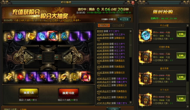 【风云无双】积分抽奖(具体奖励内容以游戏中为准)玩家每进行充值10RMB就会获得10积分,积分可在积分抽奖中抽取相应物品,会上架一些超值的道具供玩家限时元宝兑换【活动时间】: 3月20日-3月22日【活动范围】:除 ...