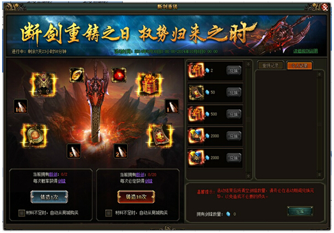 断剑重铸,权势归来(具体奖励内容已游戏中为准)【活动时间】3月21日-3月23日【活动范围】未在开服活动中的区服【活动内容】活动期间,可使用断剑进行铸造,每次铸造消耗两个断剑,。铸造后有机会获得道具奖励或剑 ...