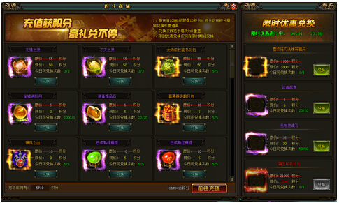 【风云无双】积分商城(具体奖励内容以游戏中为准)玩家每进行充值10RMB就会获得10积分,积分可在积分商城处兑换道具,更有限时优惠兑换,会上架一些超值的道具供玩家限时兑换【活动时间】:3月25日-3月26日【活动范 ...