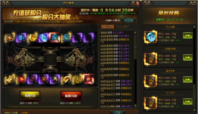 【风云无双】积分抽奖(具体奖励内容以游戏中为准)玩家每进行充值10RMB就会获得10积分,积分可在积分抽奖中抽取相应物品,会上架一些超值的道具供玩家限时元宝兑换【活动时间】: 3月27日【活动范围】:除开服活动 ...
