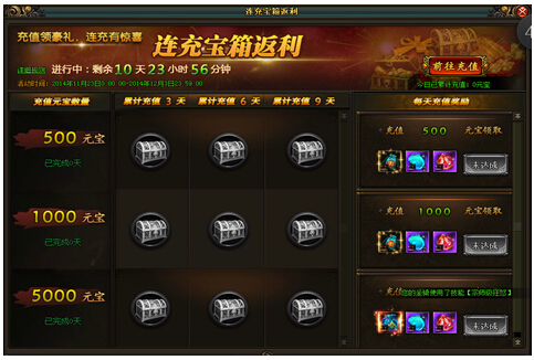【风云无双】连冲宝箱返利活动(具体奖励内容已游戏中为准) 【活动时间】4月10日-4月19日【活动内容】活动期间每日充值达到对应数量元宝,即可领取“每日充值奖励”;活动期间累计充值天数与充值元宝数均达到对应要 ...