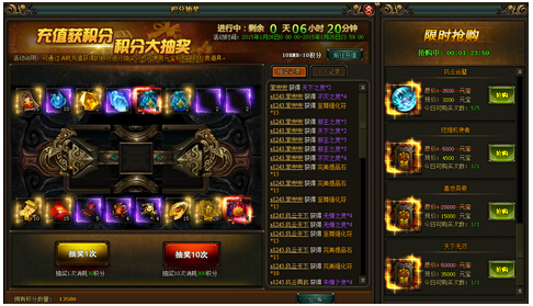 【风云无双】积分抽奖(具体奖励内容以游戏中为准)玩家每进行充值10RMB就会获得10积分,积分可在积分抽奖中抽取相应物品,会上架一些超值的道具供玩家限时元宝兑换【活动时间】: 4月10日- 4月11日 【活动范围】: ...