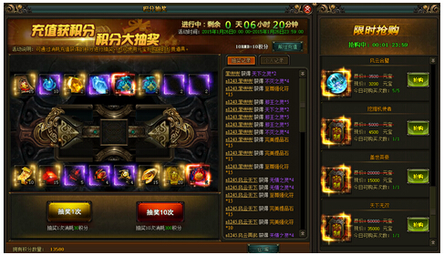 【风云无双】积分抽奖(具体奖励内容以游戏中为准)玩家每进行充值10RMB就会获得10积分,积分可在积分抽奖中抽取相应物品,会上架一些超值的道具供玩家限时元宝兑换【活动时间】: 4月14日【活动范围】:除开服活动 ...