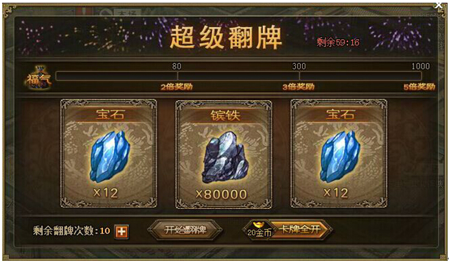 活动一超级翻牌,好礼最高5倍送! 粮食、镔铁、宝石、经验、免费借兵等多种翻牌奖励,轻松获得,极致满足。鸿运当头,不断翻到“福气牌”,不停累积“福气值”,更能豪享最高5倍奖励! 只有1天,机不可失! 活动范围 ...