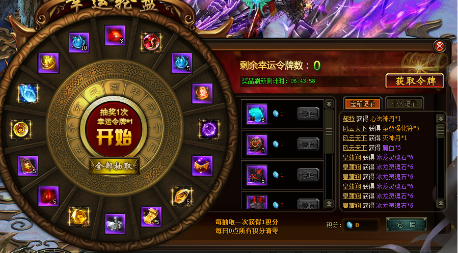 幸运轮盘(具体奖励内容已游戏中为准)【活动时间】4月28日 【活动范围】未在开服活动中的区服 【活动内容】活动期间,凡充值即可领取幸运令牌以及积分,幸运令牌可进行抽奖,积分可用来兑换奖励。 【活动一览】: ...