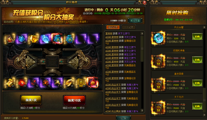 【风云无双】积分抽奖(具体奖励内容以游戏中为准)玩家每进行充值10RMB就会获得10积分,积分可在积分抽奖中抽取相应物品,会上架一些超值的道具供玩家限时元宝兑换【活动时间】: 4月29日【活动范围】:除开服活动 ...