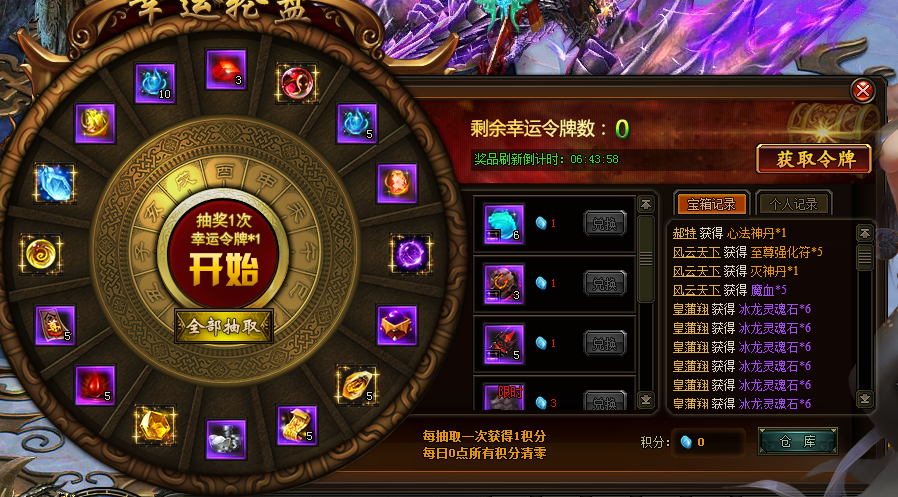 幸运轮盘(具体奖励内容已游戏中为准)【活动时间】4月29日 【活动范围】未在开服活动中的区服 【活动内容】活动期间,凡充值即可领取幸运令牌以及积分,幸运令牌可进行抽奖,积分可用来兑换奖励。 【活动一览】: ...