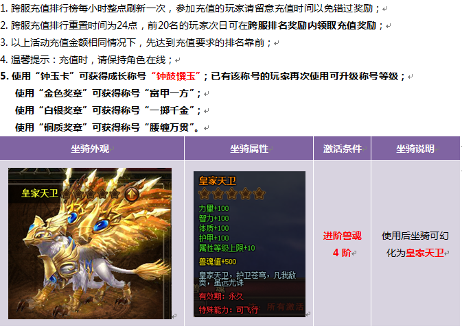 充值排行全新升级 飞行坐骑展翅翱翔活动一、充值排行(跨服) 【活动时间】2015年5月6日00:00~5月10日23:59 【活动范围】截止到4月29日(含29日)开服的大区均上此活动 【活动内容】活动期间,跨服累积充值排名, ...