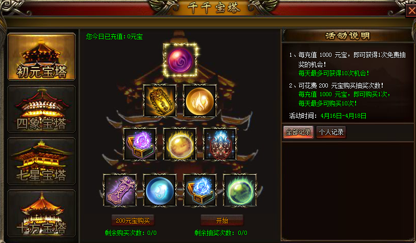 七杀 - 千千宝塔 活动时间:5月7日00:00 - 5月9日23:59 初元宝塔 1、每充值1000元宝,即可获得1次免费抽奖的机会! 每天最多可获得10次机会! 2、可花费200元宝购买抽奖次数! ...