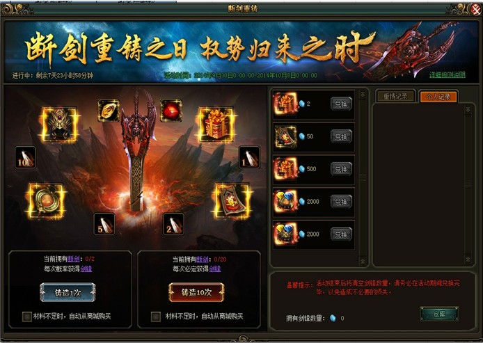 断剑重铸,权势归来(具体奖励内容已游戏中为准)【活动时间】5月8日-5月11日【活动范围】未在开服活动中的区服【活动内容】活动期间,可使用断剑进行铸造,每次铸造消耗两个断剑,。铸造后有机会获得道具奖励或剑锋 ...