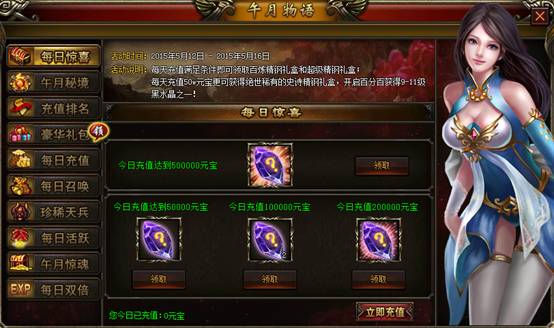 《七杀》午月物语 活动一、每日惊喜 【活动时间】:5月12日00:00 – 5月16日23:59 【活动说明】:每天充值满足条件即可领取百炼精钢礼盒和超级精钢礼盒;每天充值50W元宝更可获得绝世 ...