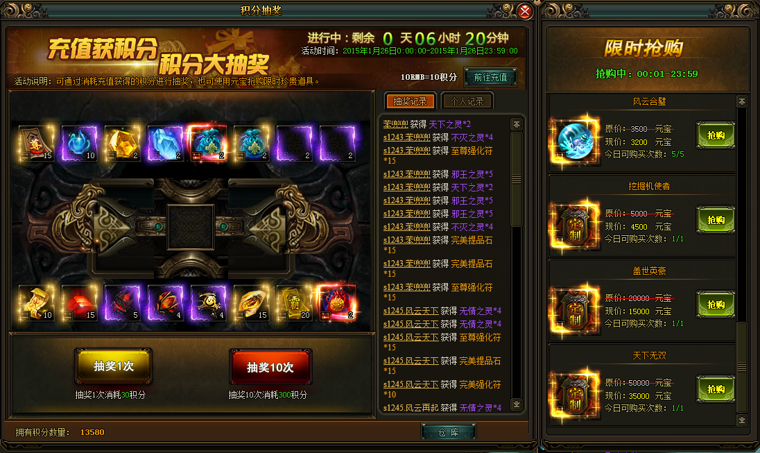 【风云无双】积分抽奖(具体奖励内容以游戏中为准) 玩家每进行充值10RMB就会获得10积分,积分可在积分抽奖中抽取相应物品,会上架一些超值的道具供玩家限时元宝兑换【活动时间】: 5月26日-5月28日【活动范围】:除 ...