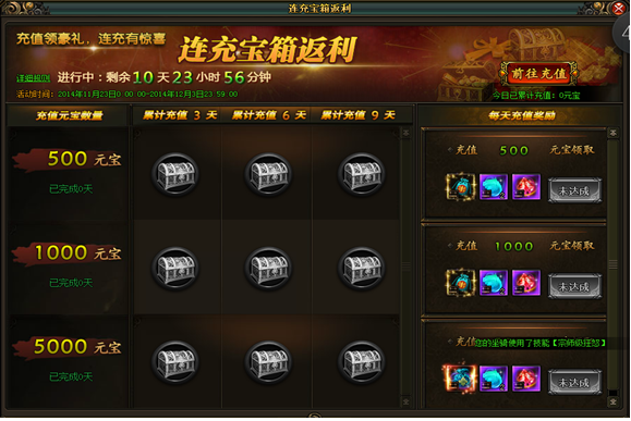 【风云无双】连冲宝箱返利活动(具体奖励内容已游戏中为准) 【活动时间】5月26日-6月3日【活动内容】活动期间每日充值达到对应数量元宝,即可领取“每日充值奖励”;活动期间累计充值天数与充值元宝数均达到对应要 ...