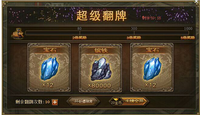 《攻城掠地》6月3日 活动公告 活动一超级翻牌,好礼最高5倍送! 粮食、镔铁、宝石、经验、免费借兵等多种翻牌奖励,轻松获得,极致满足。鸿运当头,不断翻到“福气牌”,不停累积“福气值”,更能豪享最高5倍奖励! ...