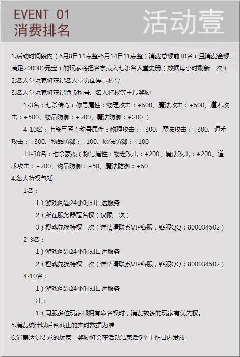 本帖最后由 次世代页游小兵 于 2015-6-10 19:58 编辑 6月8日11点整-6月14日11点整,消费总额前30名(且消费金额满足200000元宝)的玩家将把名字载入七杀名人堂史册、绝版称号(加属性)、名人特权等。同时,玩家 ...