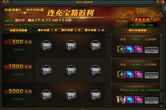 【风云无双】连冲宝箱返利活动(具体奖励内容已游戏中为准) 【活动时间】6月22日-6月30日【活动内容】活动期间每日充值达到对应数量元宝,即可领取“每日充值奖励”;活动期间累计充值天数与充值元宝数均达到对应要 ...