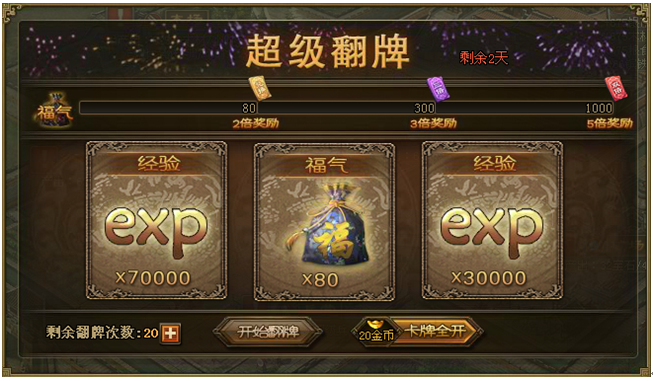 本帖最后由 冥王Fan 于 2015-6-24 23:16 编辑 【全新】超级翻牌,好礼最高5倍送,再添丝绸优惠券!超级翻牌翻新样,奖励更有料!即本次活动起,对开启“丝绸之路”功能的玩家,活动中新增奖励3种“丝绸优惠券”, ...