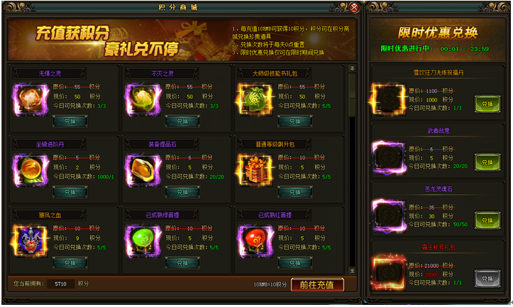 【风云无双】积分商城(具体奖励内容以游戏中为准)玩家每进行充值10RMB就会获得10积分,积分可在积分商城处兑换道具,更有限时优惠兑换,会上架一些超值的道具供玩家限时兑换【活动时间】:7月4日-7月7日【活动范围 ...