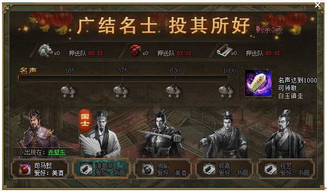 【全新】广结名士,国士新登场,奖励更奢华! 盛夏炎炎,福利送爽!继“广结名士”活动新赠西域锦囊之后,自本次起,携带奢华重礼的高级名士“国士”新登场,结交奖励全面翻升!依旧三天游走世界去结交,不同丰厚奖 ...