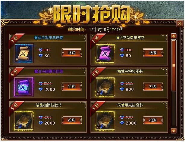 圣导师限时抢购活动时间:2015.7.2800:00:00-2015.7.28 23:59:59 活动范围:仅限圣导师职业参与 活动内容:低折扣限时出售以下道具 魔法书攻击羊皮卷、魔法书英勇羊皮卷、魔法书骁勇羊皮卷、梅林守护技能书、暗影枷 ...